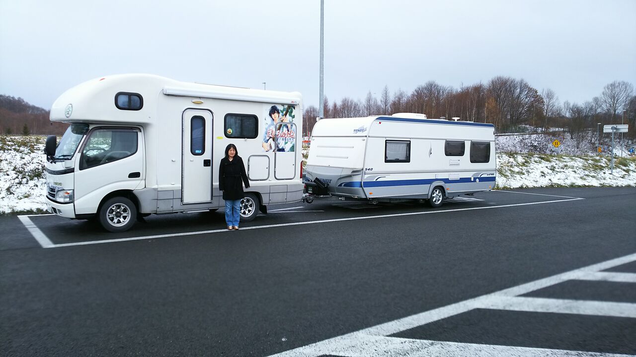 今回の車両も、FFヒ-タ-はプロパンガス仕様なので、この厳寒の地には不足だ。以前のホビ-にはべバストを付けた。フェントには、プロパンガスボンベ8k×2の処10kが2基載る事が判り、道内だけの使用なので、それなら多少の炊き続けは可能だと感じる。カムロ-ド引いた感じは、そんなに違和感もなく気楽な感じで牽ける。だが、燃費はすこぶる悪い!多分6km/Lくらいだろうか??帰りに気になり、予備の20Lを足した、明日にも給油するので判明するだろう。